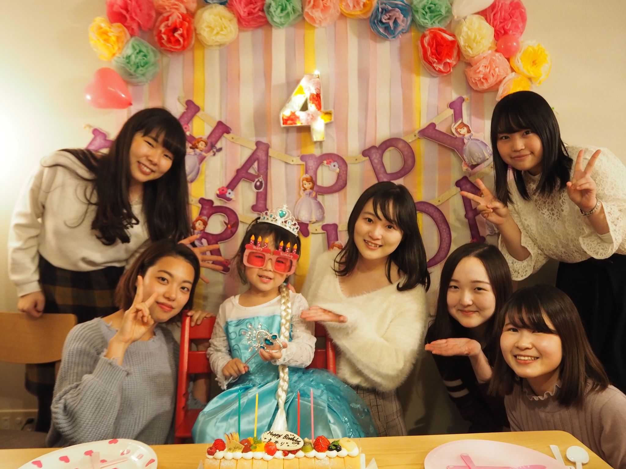 娘さんの4歳のお誕生日会での様子。歴代のインターン経験者6名が集まり、みんなで飾り付けをしてお祝いしてくれたのだそうです