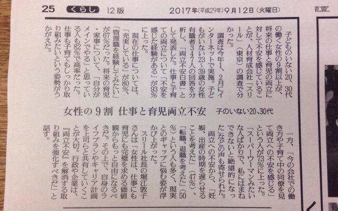 ●読売新聞 朝刊 家庭くらし面 『女性の9割仕事と育児両立不安』