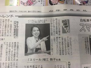9/17(日)の共同通信にて「起業家たち」のコーナーにて、掲載していただきました。