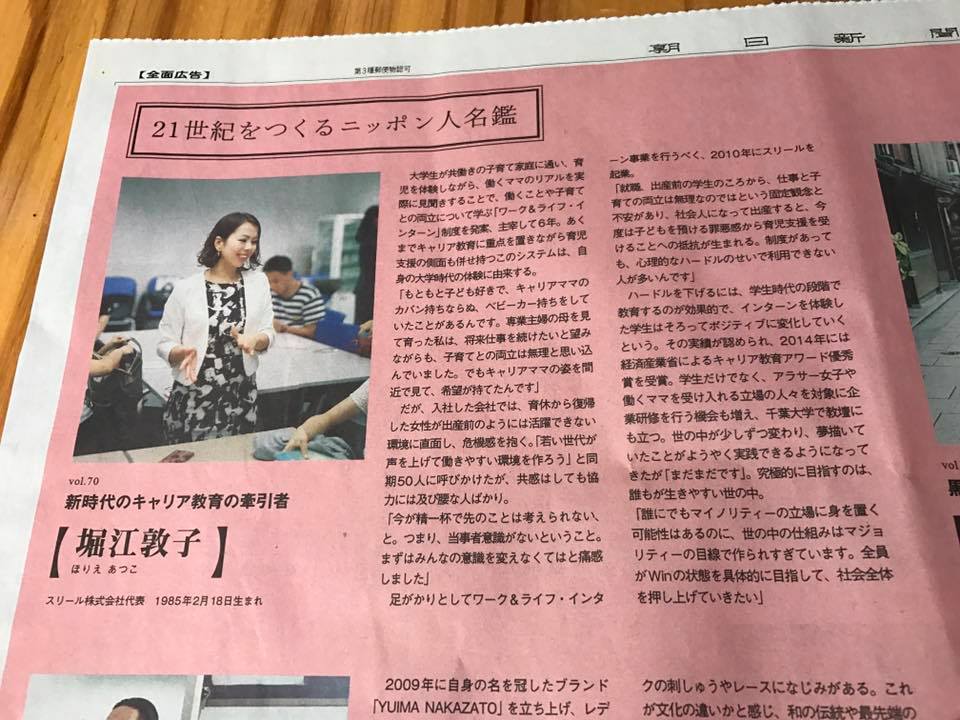 本日3/27(月)の朝日新聞「21世紀をつくるニッポン人名鑑」にて、新時代のキャリア教育の牽引者として、代表堀江が掲載いただきました。