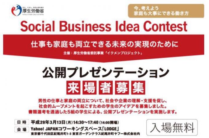 代表堀江が委員を務めている、厚生労働省イクメンPJが主催する大学生によるアイディアコンテスト。