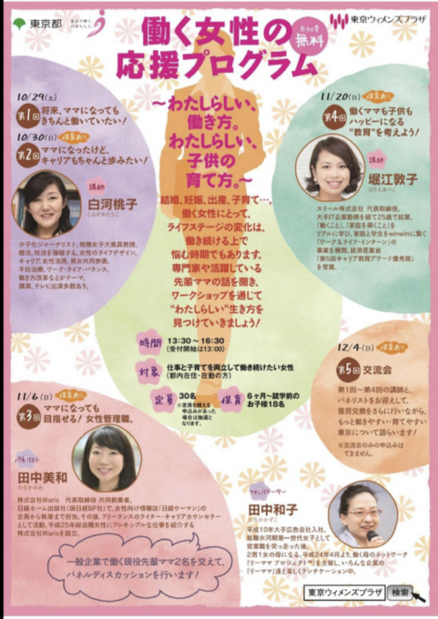 東京ウィメンズプラザで開催する「働く女性の応援プログラム〜わたしらしい、働き方。わたしらしい、子供の育て方。〜」にて、