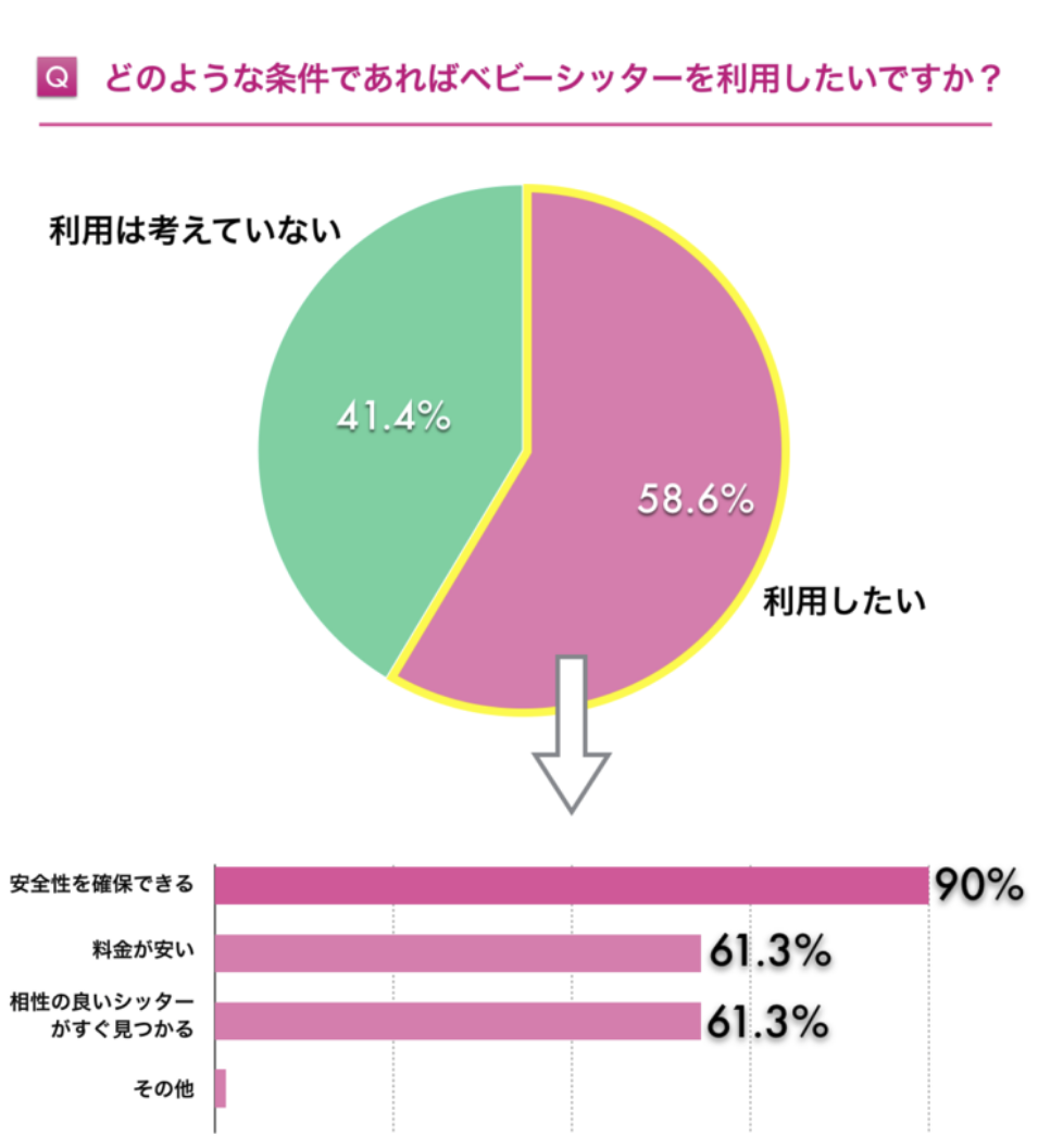 ベビーシッターやファミリーサポート、病児保育などの保育サポートを利用したくても利用しないという状況もあります。キッズラインの調査によると、ベビーシッターを使用したいと答えた人が「58.6%」もいたにも関わらず、実際に利用した人は「5%」に留まっています。ベビーシッター利用後の調査では、利用への抵抗感は「28.2%」と、利用前の「72.1%」比べて大幅に減少しました。その理由は、「シッターとの信頼関係ができた」(73.7%)、「子どもにも良い影響があると感じた」(58.3%)、「安全面、盗難・物損がないとわかった」(40.0%)という結果でした。