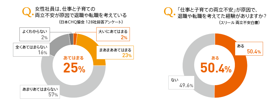 さらに、両立不安白書の調査では、その不安から「退職・転職」を考えると回答した人は、50.4%に上りました。つまり「2人に1人」は、不安だけが原因で退職・転職を考えるということです。