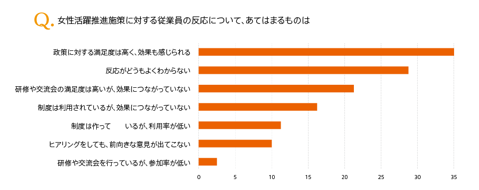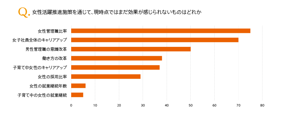 「女性活躍推進施策を通じて、現時点ではまだ効果が感じられないものはどれか」という質問に対して、最も多かったものが「女性管理職比率」と「女性社員全員のキャリアアップ」に次いで「男性管理職の意識改革」でした。まだ女性社員全体のキャリアアップや女性管理職比率を上げていくことへの全体の雰囲気が広がっていない状況が伺えます。