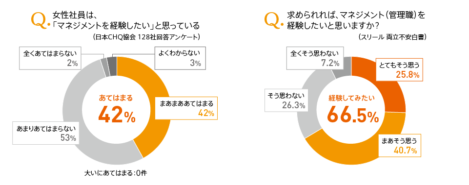 また、「マネジメントを経験したい」と感じている人は、両立不安白書では「66.3%」。人事部では「42%」でした。一致まではいかないものの、ある一定の女性社員がマネジメントも経験したいと考えていることの認識はされている企業が多いということが伺えます。
