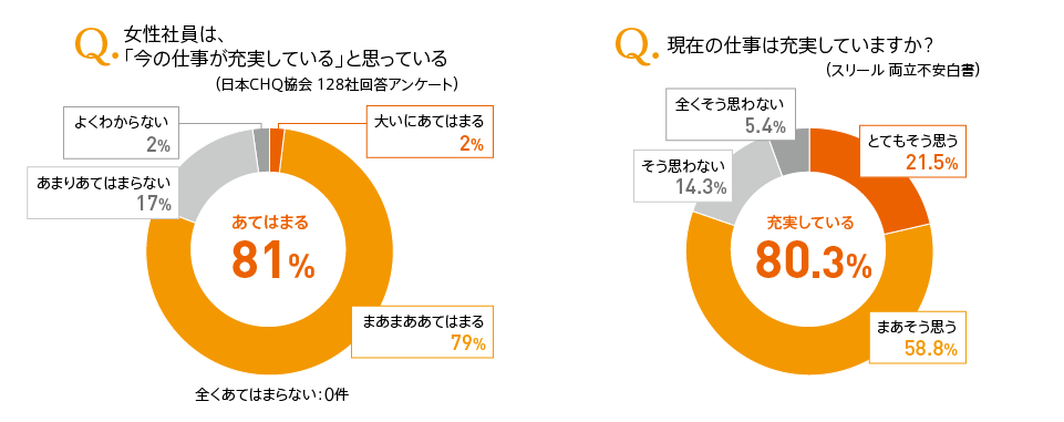 「今の仕事が充実している」と感じている人は、両立不安白書では「80.3%」。人事部では「81%」でした。