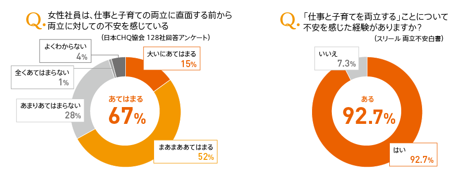 両立不安白書の調査にて92.7%の女性は、仕事と子育ての両立に直面する前から、両立を不安に感じていると回答していました。
