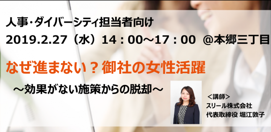 ※なお、以前に【なぜ進まない?御社の女性活躍】等スリールの講座をご受講いただいた方は、後半パート<体験ミニワーク>からのご参加も可能です。ご希望の方は、お申し出ください。