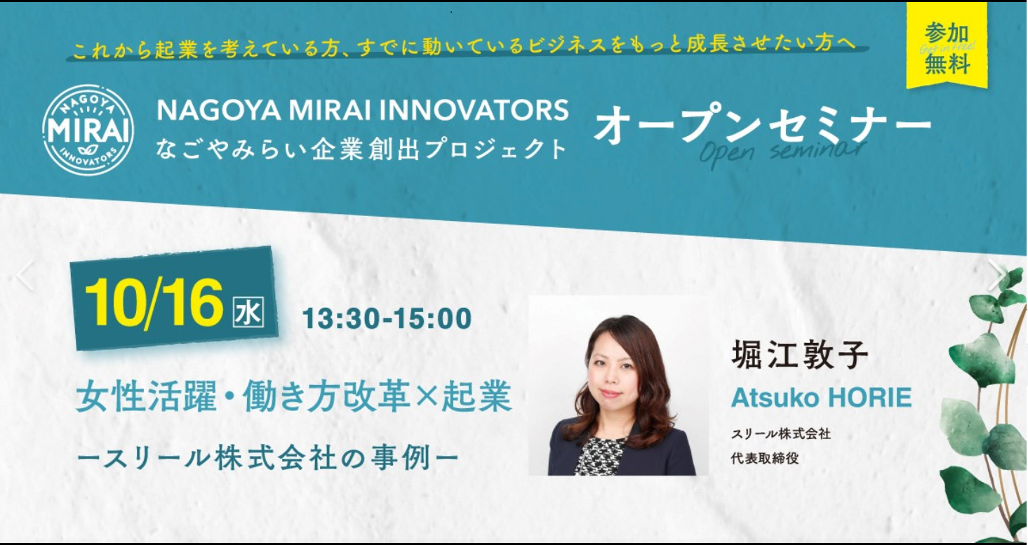 「女性活躍・働き方改革×起業ースリール株式会社の事例ー」 日時:2019/10/16(水) 13:30-15:00 |