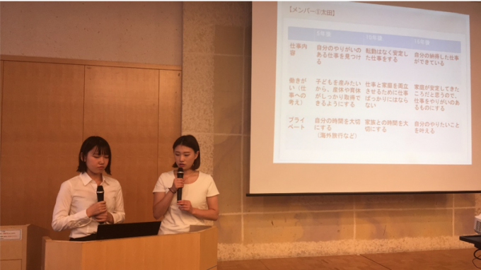 京都府内で働きながら子育てをする家庭にご協力いただき、学生はペアで両立体験(子育てインターン)に伺いました。両立体験をする中で感じた社会課題、【仕事と子育てを両立しやすい社会にするために「●●」ができること】をテーマのアイデアプレゼンテーションです。