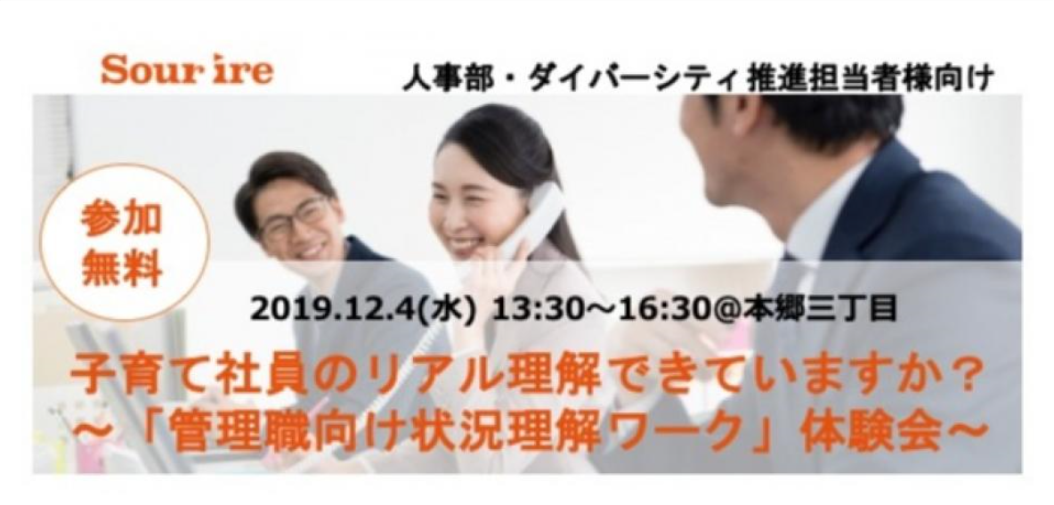 | ◼︎セミナー詳細 ・日時:2019年12月4日(木)13:30 – 16:30 (開場13:15) ・場所:socialhiveHONGO 4F ・東京都文京区本郷三丁目40番10号 三翔ビル本郷4F 小野田髙砂法律事務所内 ・参加費:無料 ・定員:8名 ・対象:人事部、ダイバーシティ推進部ご担当者様 ・内容: ※プログラム内容は一部変更になる可能性がございます。 〈講義〉 ・子育て中社員を取り巻く環境ー両立不安、脳内構造ー 〈体験ミニワーク〉 〈参加者同士の交流会〉 |
