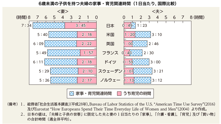 内閣府 男女共同参画局, 男女共同参画白書 平成30年版 , 第2節 仕事と子育て・介護の両立の状況, -3-8図 6歳未満の子供を持つ夫婦の家事・育児関連時間(1日当たり,国際比較)