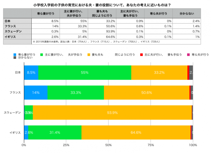 日本では、6割強が「妻のみ(もしくはメイン)」で行なっており、「妻も夫も同じように行う」比率は3割程度。「妻も夫も同じように行う」割合が5割を超える欧州各国に比べ、日本のワンオペの実情が浮き彫りになっています。