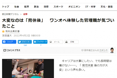 【メディア掲載】朝日新聞デジタル「大変なのは「育休後」 ワンオペ体験した管理(...)
